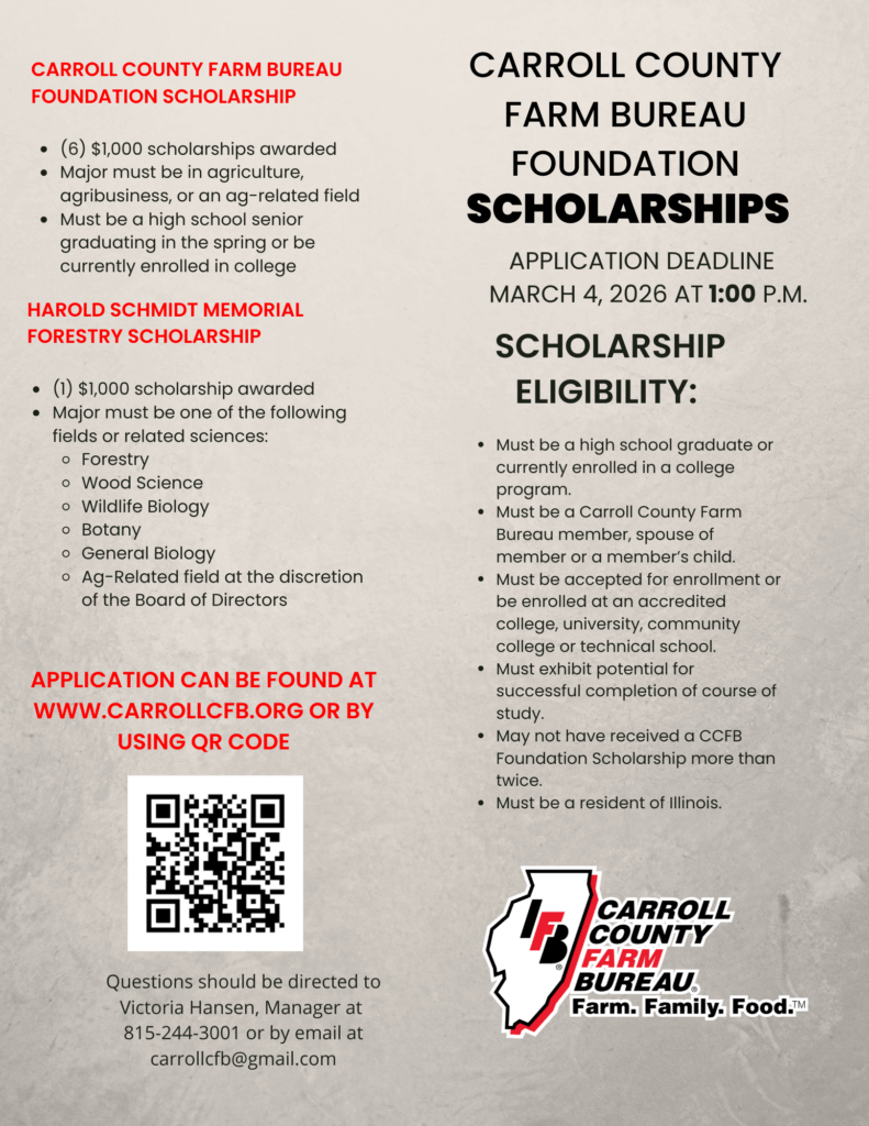 To learn more contact Victoria Hansen at 815-244-3001 or by email at carrollcfb@gmail.com.